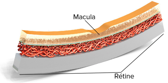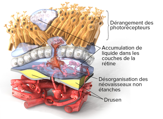 Dans la DMLA humide, la prolifération anormale de vaisseaux sanguins au-dessous de la macula est le résultat d’un processus appelé « angiogenèse ». Ces vaisseaux anormaux laissent échapper du liquide et du sang susceptibles d’entraîner la formation, sous la macula, d’une poche en forme de bulle. Ces bulles déforment la vision de l’œil atteint, les lignes droites semblant alors onduler. Le patient peut percevoir une ou plusieurs taches sombres au centre de sa vision. Ce phénomène est dû à l’accumulation (ou collection) de sang ou de liquide sous la macula.