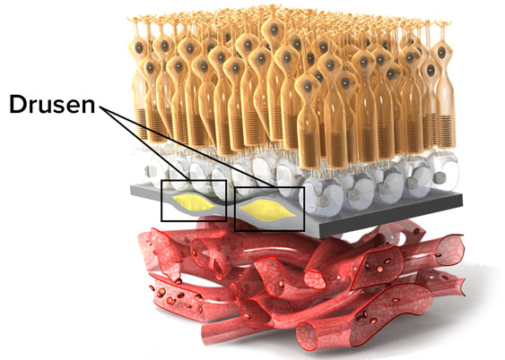 La DMLA sèche, ou atrophique, est la forme de DMLA la plus fréquente, dont les stades précoce et intermédiaire représentent environ 90 % de l’ensemble des cas. Au stade précoce de la DMLA sèche, on observe un déclin de la fonction de la macula, associé à l’accumulation de « drusen » (ou druses), c’est-à-dire de dépôts jaunâtres dans la partie postérieure de l’œil, variables en taille et en nombre ; cette accumulation est considérée comme faisant partie intégrante du processus de vieillissement de l’œil. À ce stade précoce de la DMLA sèche, les drusen peuvent être de faible dimension et présents en grand nombre ou moins nombreux mais de taille moyenne et l’on ne constate pas de baisse de la vision. La DMLA sèche précoce peut évoluer vers le stade intermédiaire, avec la multiplication des drusen de faible dimension ou le développement d’un ou plusieurs drusen plus volumineux. Les symptômes qui font leur apparition au stade intermédiaire de la DMLA sèche sont la présence de zones d’ondulation ou de flou au centre de la vision et une difficulté à lire.